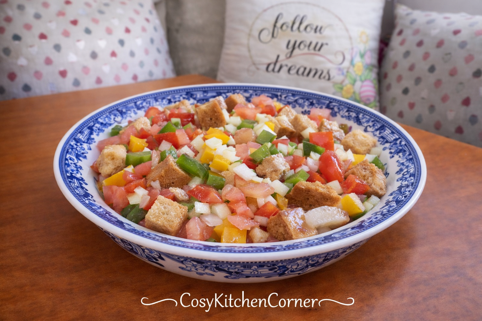 During the height of the Summer season, Pirinaca is also a light lunch all of its own. The traditional recipe is served with crusty bread, which will then be used to soak up all the juices remaining after you have finished the salad. My grandfather however, could not be bothered with having to wait for the bread to soak up, (patience was never one of his virtues) so in his recipe he would add the bread from the very beginning so it was there soaked up and prepped for whenever he felt like eating it.