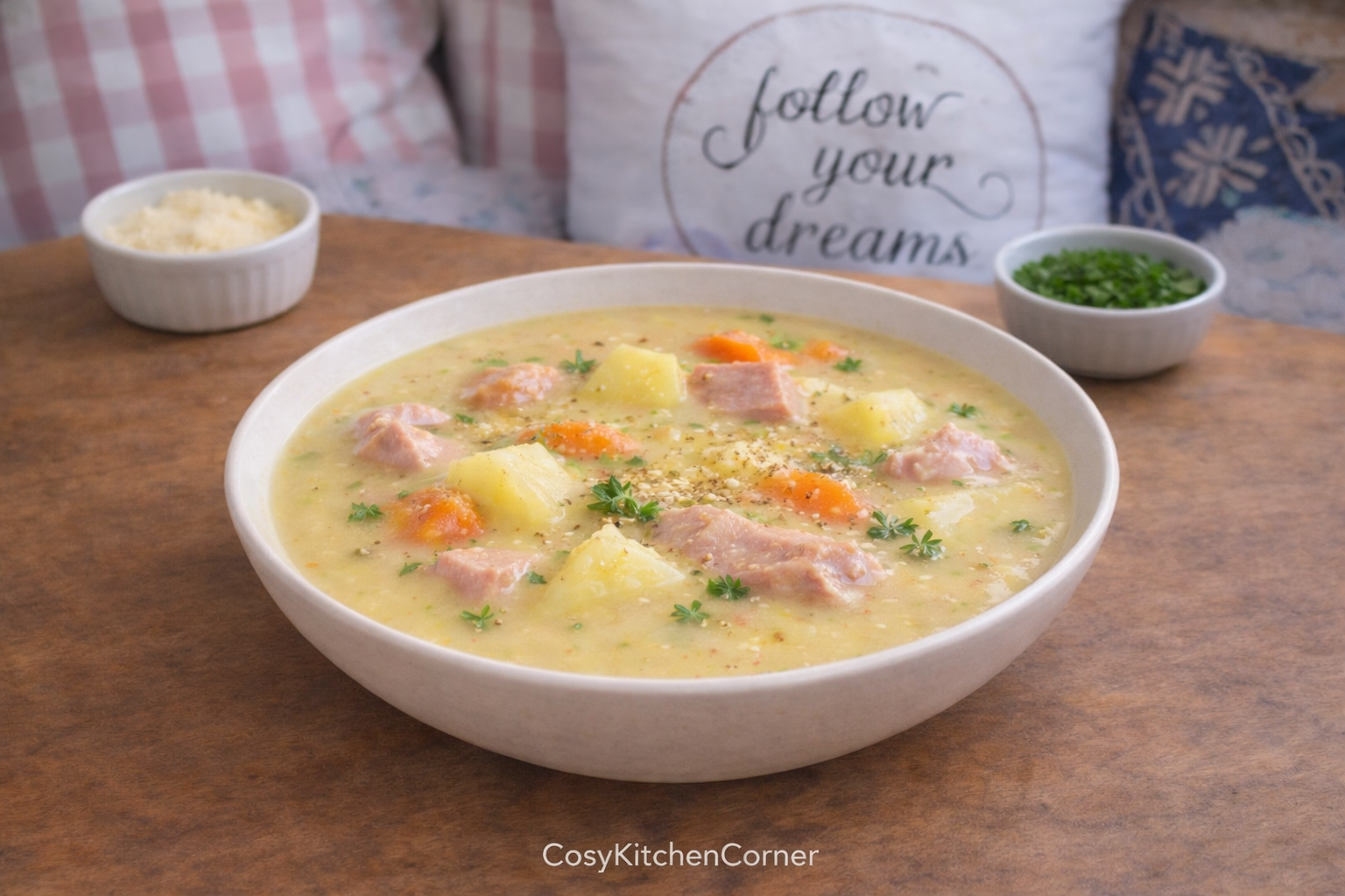 1 ham hock or 1 cup diced ham or a piece of unsmoked gammon